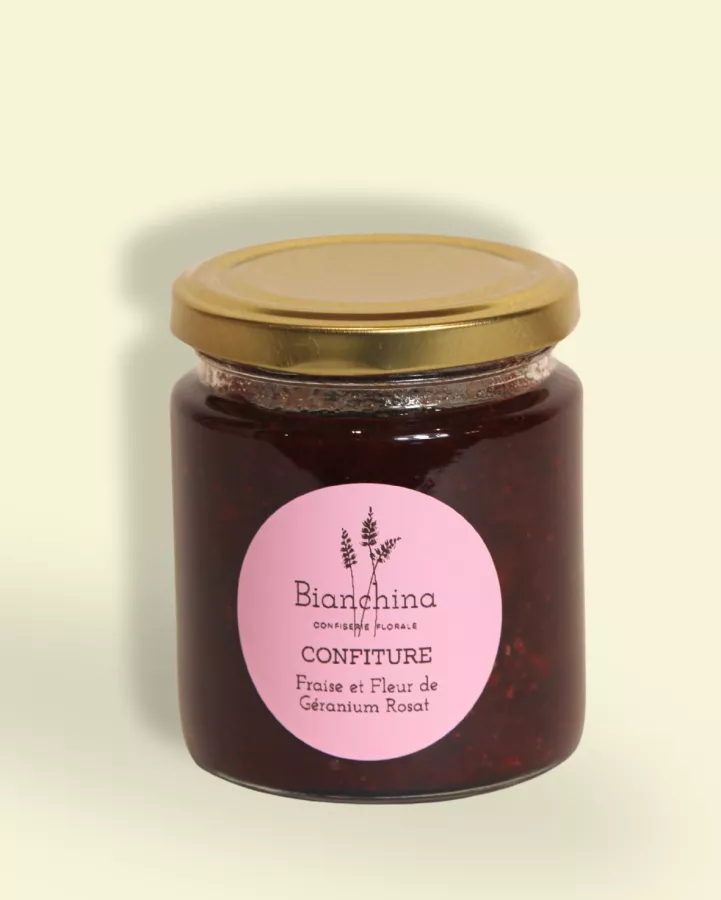 Ingrédients : Fraises, sucre de cannes non raffiné bio, fleur de Géranium Rosat et pectine d’agrumes naturelle.